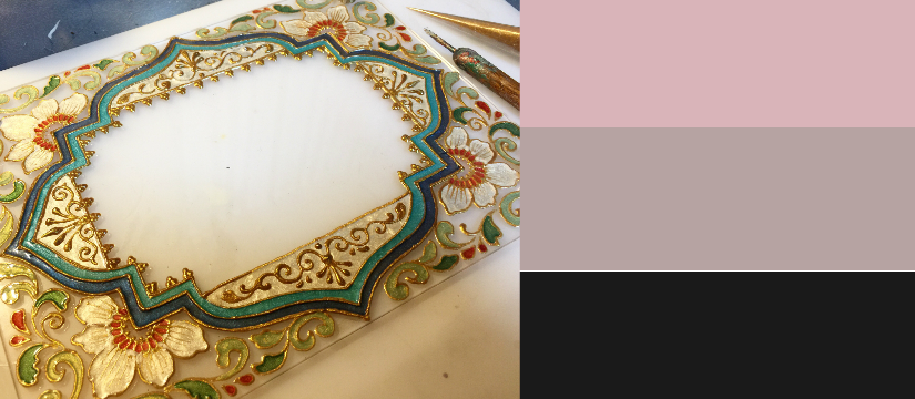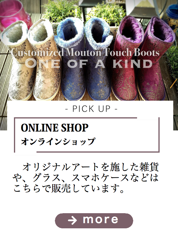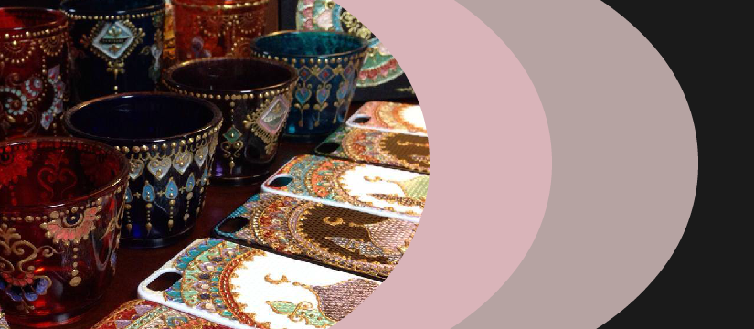 セロハンを円錐状に巻いた絞り口から、マテリアルに合った絵の具、染料を搾り出しながら絵を描く技法です。インド・中近東の伝統文化である身体装飾アート、メヘンディー(ヘナ)の技法で、ボディーアートだけでなく、アパレル、陶器、ガラス、雑貨等への絵付けをしています。専門的な道具は必要なく、テクスチャを調整することにより立体的に表現可能、誰にでも気軽に始めれる装飾(デコ)アートです。