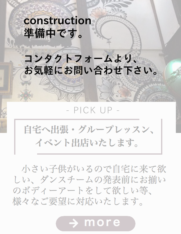 特殊な事業形態と兼業している業務が多忙のため、現在ヘナタトゥー、ジャグアタトゥーの施術のオンライン予約が取りにくくなっております。 日によってはお取りできる場合もございますので、お問い合わせ下さい。 ご不便をお掛けいたしますが、何卒ご了承下さい。
